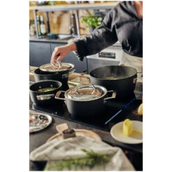 Rijst, boontjes, pasta, … koken, ui fruiten, groenten aanstoven … Voor de dagelijkse basisbereidingen kan je rekenen op deze eenvoudig te hanteren Alu Pro 5 kookpotten van 16, 18, 20 en 24 cm. Licht qua gewicht, maar niet qua prestaties. De body in gesmeed aluminium is extra dik en meer dan stevig. Dankzij de unieke Radiant bodem is en blijft je pot extra stabiel en in optimaal contact met de kookplaat. De warmte wordt egaal verspreid. De exclusieve TriplInduc® technologie presteert perfect op inductie. Je hebt tot 30% minder energie nodig voor dezelfde temperatuur. Deze potten reageren supersnel zodra je overschakelt naar een andere fornuisstand. De potten zijn ook even snel weer op de juiste temperatuur nadat er koude ingrediënten, zelfs recht uit de koelkast, in gaan. Geschikt voor alle kookplaten, zeker voor inductie. Ook bijzonder aan deze kookpot: de duurzame Duraslide Titanium® antikleeflaag verhindert dat ingrediënten aan de bodem blijven kleven of aankoeken. Bovendien maakt die de potten nog sterker en extra duurzaam. Gebruik enkel accessoires van silicone of hout, om beschadiging te vermijden. Het stijlvol vormgegeven deksel past perfect. Hierdoor blijven warmte en stoom beter bewaard en verspil je geen energie. Het deksel is net als de stevige grepen vervaardigd uit roestvrij staal met Silvinox®. Je maakt het in een-twee-drie schoon en het blijft blinken. Bovendien contrasteert het prachtig met de matzwarte potten in gesmeed aluminium.